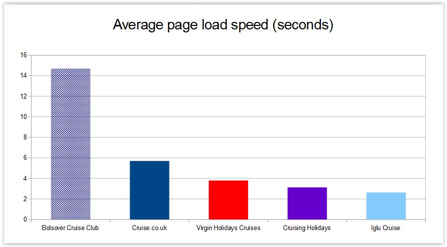 Bolsover Cruise Club had the most pronounced problems, with an average page load speed of 14.7 seconds. This was followed by Cruise.co.uk (5.7 seconds), Virgin Holiday Cruises (3.8 seconds), and Cruising Holidays (3.13 seconds).