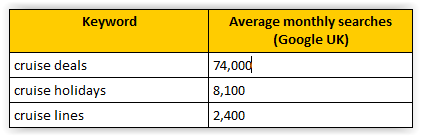 Cruise.co.uk and Bolsover Cruise Club seem to have optimised their pages for ‘cruise lines’, with both featuring the keyword six times on-page. It would be wise for both of these companies to include more mentions of ‘cruise deals’ in order to compete effectively on this keyword, which has more than 30 times the search volume. Not to mention the fact that Google’s first page results for ‘cruise lines’ are dominated by the lines themselves, rather than brokers – a difficult space to compete in.