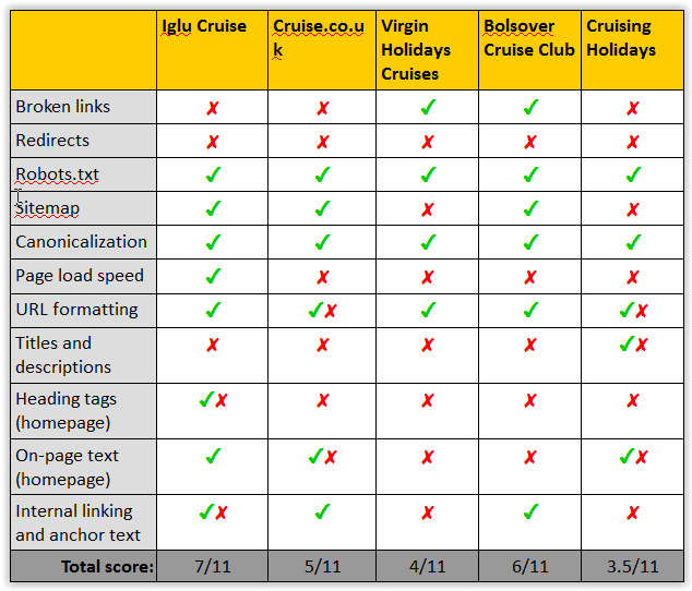 But despite our five companies presumably relying heavily on the web for their revenues, all of them failed to pass our technical SEO mini audits – by a long shot. In fact, even the best-performing brand,  Iglu Cruise, fell down on four of our 11 audit factors. The worst performer, Cruising Holidays, scored just 3.5 out of 11 (see table below).