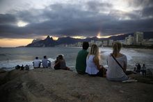Tourists enjoy the sunset on Copacabana beach in Rio de Janeiro, Brazil, … more