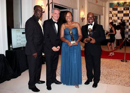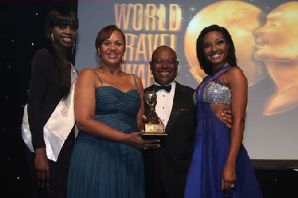 Director General Joy Jibrilu stands with Minister of Tourism the Hon. Obie Wilchcombe at the World Travel Awards. Minister Wilchcombe was awarded Travel Personality of the year.
