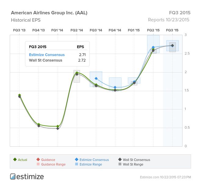 According to Estimize, American Airlines is also expected to report a very strong quarter, with earnings up more than 63 percent year-over-year, from $1.66 per share a year ago to $2.72 per share this quarter.