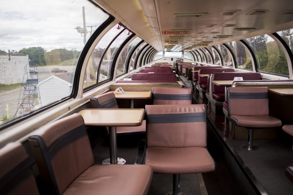 The interior of the 70-year-old dome car contains a lounge with padded swivel chairs, tables and benches, all encased in a glass dome that gives riders a 360-degree view of the scenery. as the train travels between Portland and Boston. Brianna Soukup/Staff Photographer