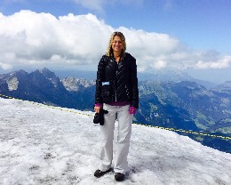 Dream Vacations franchise owner Andrea Joyce is shown traveling the globe, atop a Swiss mountaintop.