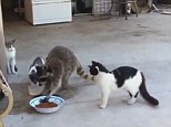 Brazen raccoon steals cat’s dinner right in front of them