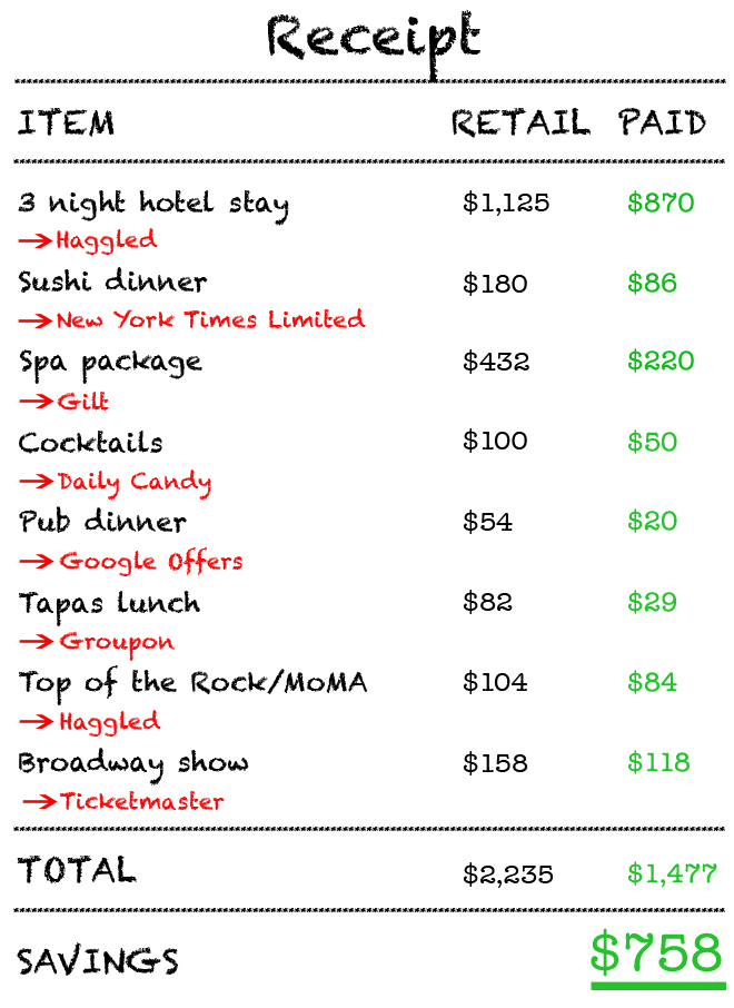 We decided on a bare-bones wish list — a couples massage, at least one Big-Apple-specific attraction, several “good” meals, a three-night hotel stay, and a Broadway show — and after a few tentative purchases, I was committing to discounted deals with abandon. (Check out a receipt of my Groupon honeymoon purchases and savings below)