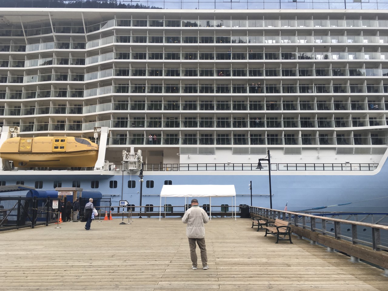 A passenger stands on the dock in Juneau near the Ovation of the Seas cruise ship, May 19, 2019. (Photo by Ryan Cunningham/KTOO)