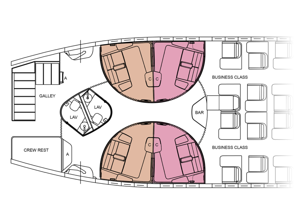 The layout for the Peacock is designed for the larger widebody aircraft, such as the Boeing 777 or Airbus A350. Airlines would be given the choice of how to configure the pointy end of the plane, allowing for quick changes depending on the demand of the route.